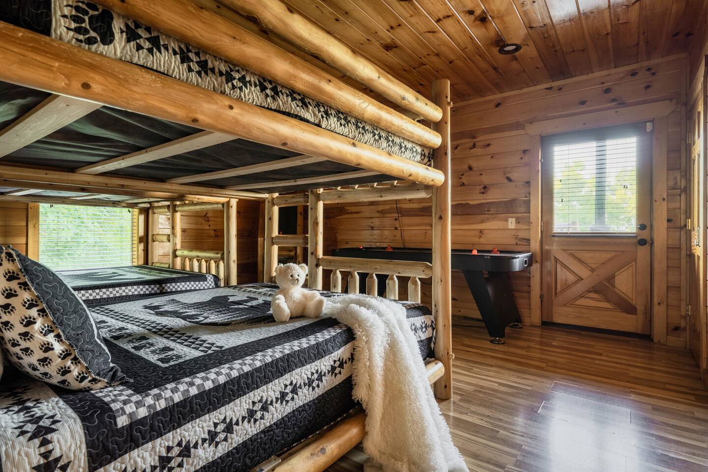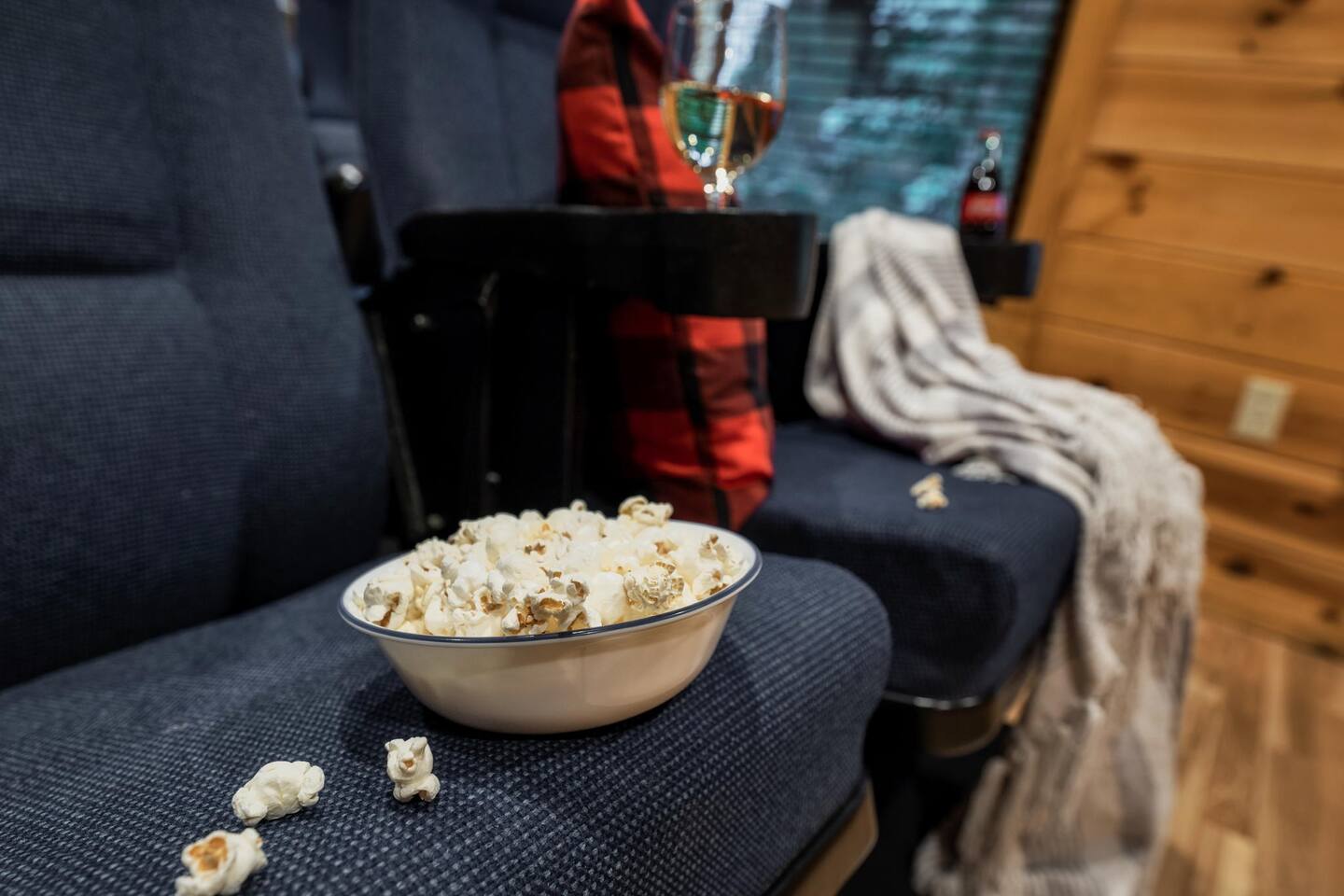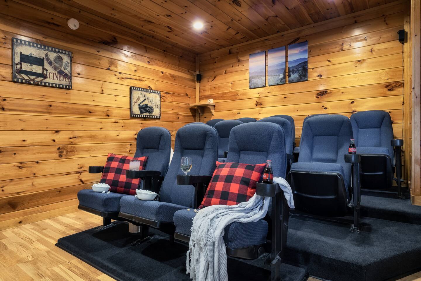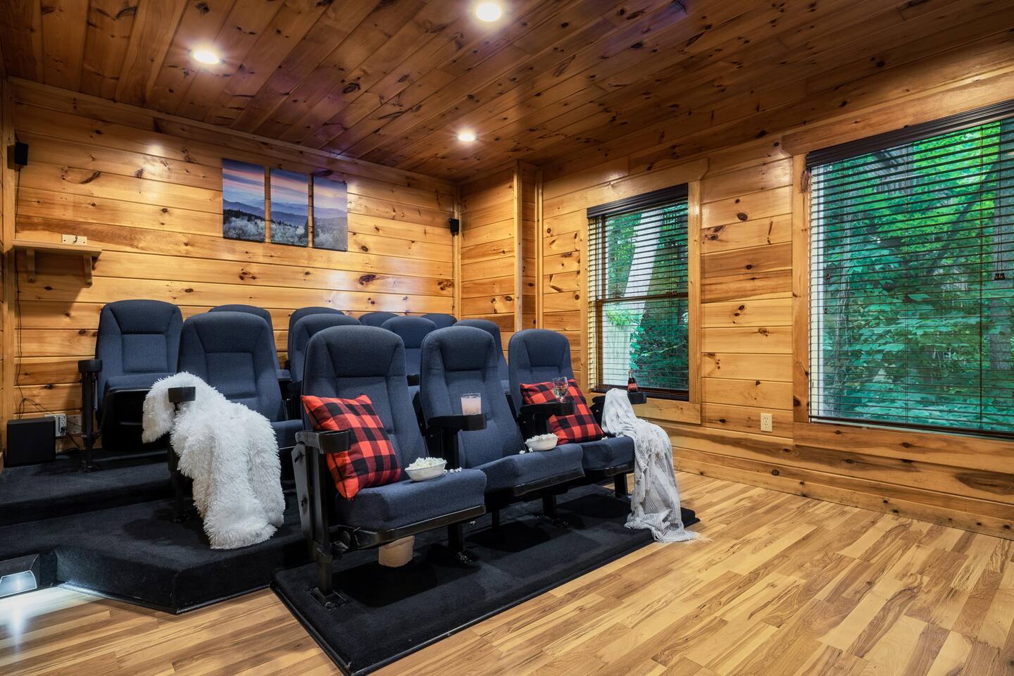 ✨ Top Features at a Glance: 🎬 Private Theater Room 🛁 Outdoor Hot Tub with Mountain Views 🔥 Gas Firepit for S’mores & Stargazing 🎮 Multicade, Foosball & Air Hockey 📶 High-Speed Wi-Fi & Roku TVs in Every Room 🛏️ Sleeps 14 | 4 Bedrooms | 3 Scenic Decks 🐾 Pet-Friendly | Self Check-In | Ample Parking 🎣Catch-and-release pond near the resort entrance 📍Prime mountainside location near Dollywood, The Island, and Pigeon Forge Welcome to Bear Time Cabin - a spacious three-level Smoky Mountain escape designed for families, friends, and unforgettable group getaways. Step into the main living area where plush leather seating, a gas fireplace, and a 55” Roku TV invite cozy conversations and downtime. Descend to your private cinematic theater, complete with a 70” screen and 10 authentic theater seats - the ultimate setting for family movie nights. The fully equipped kitchen includes a Keurig Duo, full cookware set, and all the tools needed to whip up your favorite meals. Gather at the dining table for eight, or head out to one of three scenic decks, each offering its own special way to relax and soak in the mountain air: - Upper deck: Start your day with sunrise coffee in the glider chairs, enjoy s’mores by the gas firepit, and end the night stargazing under clear mountain skies - Main-level deck: Fire up the gas grill for a barbecue feast, then enjoy your meal on the picnic table or comfy outdoor seating - Lower-level deck: Soothe tired muscles in the private hot tub while taking in peaceful mountain views Bear Time Cabin sleeps up to 14 guests across 4 bedrooms: - Upper-level king suite with private workspace, foosball table, en-suite bathroom, and direct access to the upper deck - Main-level king bedroom with access to the grill and picnic deck - Lower-level queen bedroom - Lower-level bunk room with 2 queen-over-queen bunk beds, multicade, air hockey, and deck access to the hot tub The two lower-level bedrooms share a Jack-and-Jill bathroom, perfect for families or groups who want connected space and convenience. Each bedroom has its own Roku TV, and strong Wi-Fi throughout makes it easy to stream, work, or stay connected. Bathrooms are stocked with fresh towels and premium toiletries, including shampoo, conditioner, body wash, and hand soap — so no need to overpack. Additional amenities include central heat/AC, a washer/dryer, and self-check-in with a personalized code. The road is fully paved from the main road to the cabin, but there is a short steep section near the gated entrance — please drive with care, especially at night or during winter weather. 🅿️ Parking: Two full-size vehicles can park in the private driveway, with more space available along the fence line and at the catch-and-release pond near the entrance. 📋 Other Notes: No early check-in or late checkout; if available, $50/hour applies Pets allowed with pre-approval and $95 fee per pet, per stay Whether it’s a birthday bash, family reunion, or a well-deserved mountain escape, Bear Time Cabin delivers the views, comfort, and space to make memories that last.