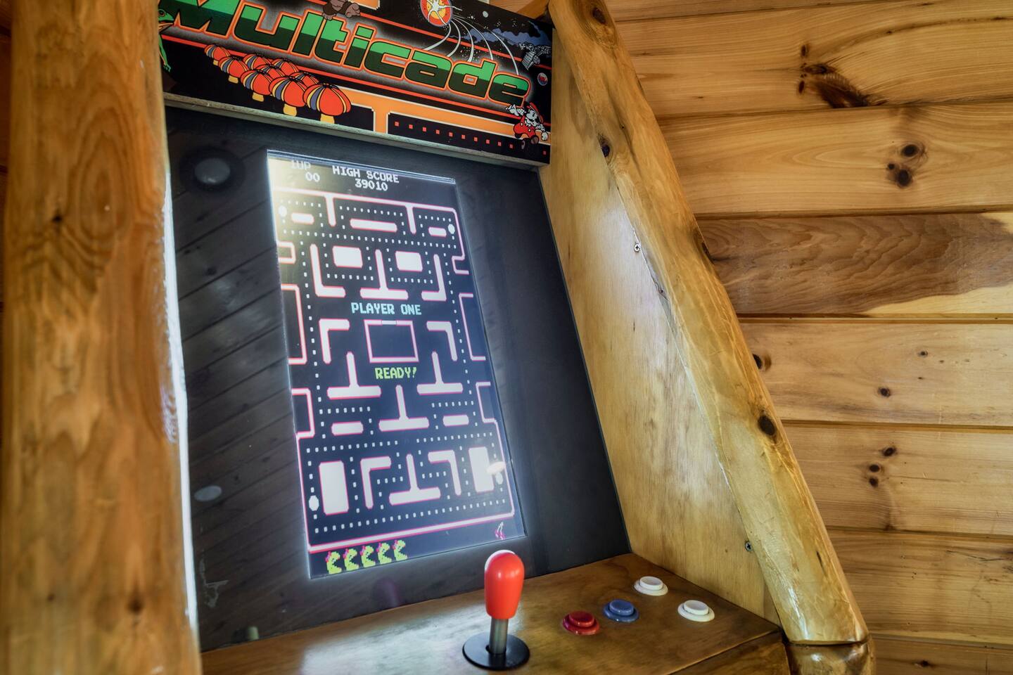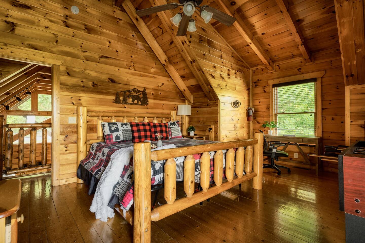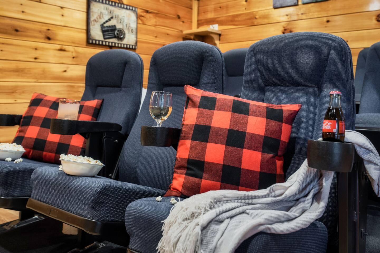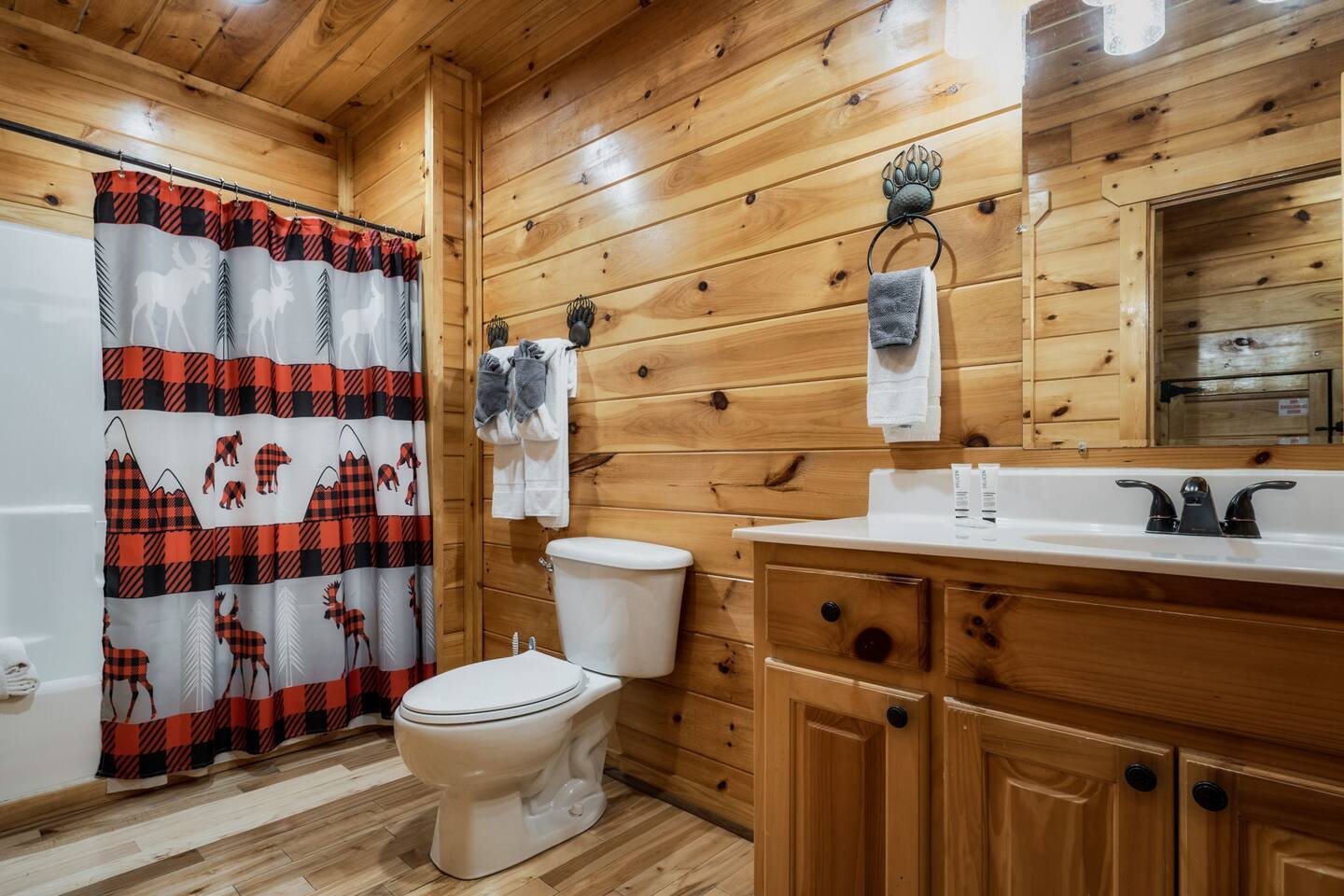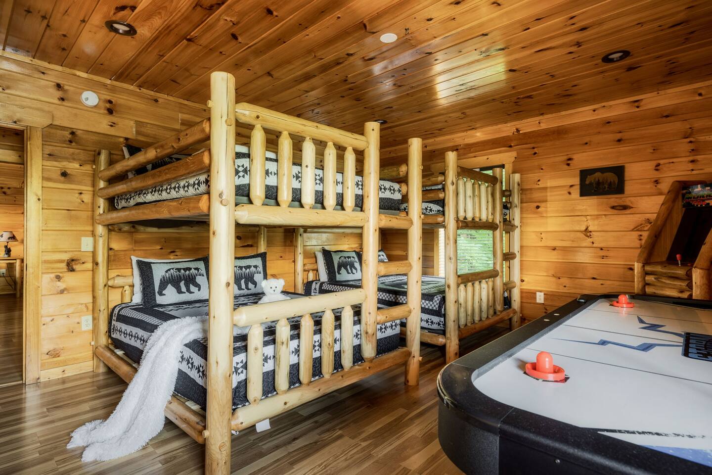 ✨ Top Features at a Glance: 🎬 Private Theater Room 🛁 Outdoor Hot Tub with Mountain Views 🔥 Gas Firepit for S’mores & Stargazing 🎮 Multicade, Foosball & Air Hockey 📶 High-Speed Wi-Fi & Roku TVs in Every Room 🛏️ Sleeps 14 | 4 Bedrooms | 3 Scenic Decks 🐾 Pet-Friendly | Self Check-In | Ample Parking 🎣Catch-and-release pond near the resort entrance 📍Prime mountainside location near Dollywood, The Island, and Pigeon Forge Welcome to Bear Time Cabin - a spacious three-level Smoky Mountain escape designed for families, friends, and unforgettable group getaways. Step into the main living area where plush leather seating, a gas fireplace, and a 55” Roku TV invite cozy conversations and downtime. Descend to your private cinematic theater, complete with a 70” screen and 10 authentic theater seats - the ultimate setting for family movie nights. The fully equipped kitchen includes a Keurig Duo, full cookware set, and all the tools needed to whip up your favorite meals. Gather at the dining table for eight, or head out to one of three scenic decks, each offering its own special way to relax and soak in the mountain air: - Upper deck: Start your day with sunrise coffee in the glider chairs, enjoy s’mores by the gas firepit, and end the night stargazing under clear mountain skies - Main-level deck: Fire up the gas grill for a barbecue feast, then enjoy your meal on the picnic table or comfy outdoor seating - Lower-level deck: Soothe tired muscles in the private hot tub while taking in peaceful mountain views Bear Time Cabin sleeps up to 14 guests across 4 bedrooms: - Upper-level king suite with private workspace, foosball table, en-suite bathroom, and direct access to the upper deck - Main-level king bedroom with access to the grill and picnic deck - Lower-level queen bedroom - Lower-level bunk room with 2 queen-over-queen bunk beds, multicade, air hockey, and deck access to the hot tub The two lower-level bedrooms share a Jack-and-Jill bathroom, perfect for families or groups who want connected space and convenience. Each bedroom has its own Roku TV, and strong Wi-Fi throughout makes it easy to stream, work, or stay connected. Bathrooms are stocked with fresh towels and premium toiletries, including shampoo, conditioner, body wash, and hand soap — so no need to overpack. Additional amenities include central heat/AC, a washer/dryer, and self-check-in with a personalized code. The road is fully paved from the main road to the cabin, but there is a short steep section near the gated entrance — please drive with care, especially at night or during winter weather. 🅿️ Parking: Two full-size vehicles can park in the private driveway, with more space available along the fence line and at the catch-and-release pond near the entrance. 📋 Other Notes: No early check-in or late checkout; if available, $50/hour applies Pets allowed with pre-approval and $95 fee per pet, per stay Whether it’s a birthday bash, family reunion, or a well-deserved mountain escape, Bear Time Cabin delivers the views, comfort, and space to make memories that last.