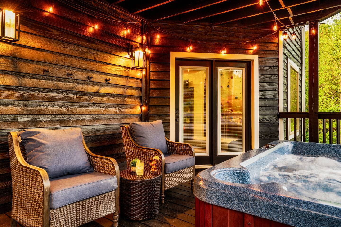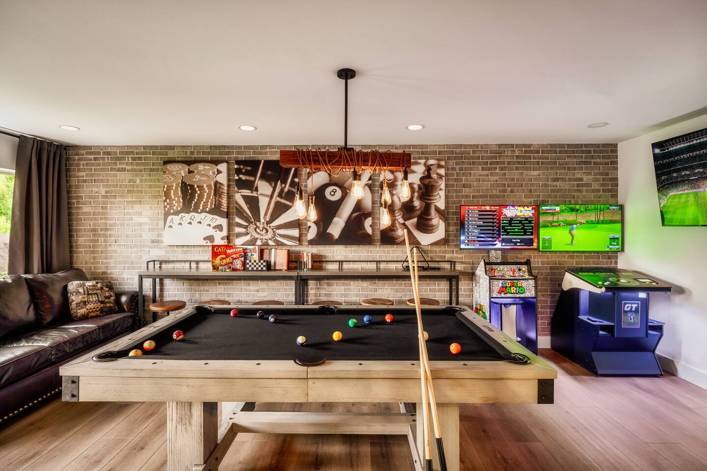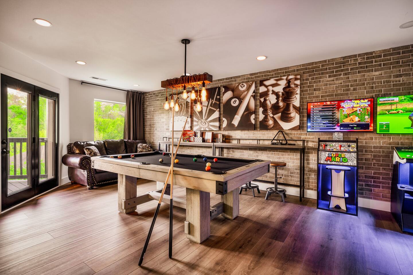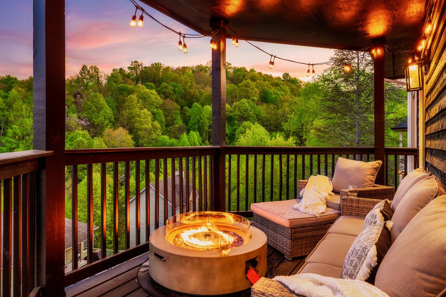 ✹ Unbeatable Breathtaking Views: Three private decks offer stunning mountain vistas, ideal for morning coffee, sunset cocktails, or stargazing by the firepit. ✹ Elegant Living Spaces: The open-concept living area features a striking 3-sided electric fireplace and a 65” smart TV, giving you a cozy, stylish place to unwind. ✹ Culinary Haven: A gourmet kitchen awaits with top-of-the-line appliances, an espresso machine, and a K-brew coffee maker. Enjoy your meals around a spacious dining table for 8, or dine al fresco with the mountains as your backdrop. ✹ Luxurious Bedroom Retreats: Three private bedroom sanctuaries, including a master suite with a king bed, freestanding tub, and private deck access, promise ultimate relaxation. ✹ Perfect Work-Life Balance: The second bedroom includes a work-ready desk, perfect for remote work without sacrificing comfort. ✹ Entertainment Galore: Challenge friends and family in the expansive game room with a pool table, multicade, and Golden Tee golf – plus a fun rock climbing wall for the kids. ✹ Hot Tub Bliss: Soak in a premium hot tub while gazing at the mountains. It’s the ultimate way to unwind after a day of exploring. ✹ Firepit Gatherings: Cozy up around the firepit on a cool mountain night, sharing stories under the stars. Welcome to your luxury mountain retreat in the heart of the Smokies, where modern comfort meets breathtaking natural beauty. As you step into the open-concept living area, you'll be captivated by the stunning 3-sided electric fireplace that serves as the room's centerpiece. Sink into premium leather couches or designer accent chairs while enjoying your favorite entertainment on the impressive 65" smart TV. Just beyond, the main level deck offers your first glimpse of the magnificent mountain panoramas that surround the property. Your culinary adventures begin in our fully equipped kitchen, where sleek stainless steel appliances await your creativity. Start your mornings with the perfect brew from our espresso machine or K-brew coffee maker, then gather with loved ones around the elegant 8-person dining table. For an unforgettable dining experience, step onto the deck where al fresco meals come with a side of stunning mountain views. Each of our three thoughtfully designed bedrooms offers its own private sanctuary. The upper-level primary suite boasts a sumptuous king bed and a luxury ensuite bathroom featuring a free-standing tub, anti-fog mirrors, and private deck access. The second bedroom provides another king bed and a modern workspace perfect for remote work, complete with its own ensuite bathroom. On the lower level, families or groups will appreciate the queen-over-queen bunk bed with a private bath, ensuring comfort and privacy for all guests. Entertainment abounds in our expansive game room, a space designed for creating lasting memories. Challenge your companions to a game of pool, explore over 3,000 classic games on the multicade machine, or perfect your swing with Golden Tee golf. For our younger guests, an exciting rock climbing wall in the bunk room provides additional adventure under adult supervision. The outdoor living spaces truly set our chalet apart, with three private decks showcasing the majesty of the Smokies. Soak in the premium hot tub while drinking in mountain vistas, gather around the outdoor firepit dining table for memorable meals under the stars, or simply unwind in the cozy conversation area by the firepit. We've thought of everything to make your family comfortable, from a Pack 'n Play and highchair to children's dinnerware and essential toiletries. For eco-conscious guests, we're pleased to offer a Level 2 electric vehicle charging station, allowing you to power up your electric vehicle during your stay. With free parking for three vehicles and a perfect location near downtown Gatlinburg, you'll have easy access to local attractions, restaurants, shopping, and mountain activities. Your stay includes complimentary access to resort-style amenities, including three community clubhouses (available from Memorial Day to Labor Day) with amenities including outdoor pools, pickle ball court, tennis court, and a fitness center. Experience the perfect blend of luxury and mountain charm in our welcoming chalet. Whether you're seeking adventure or relaxation, this exceptional retreat provides an unforgettable backdrop for your Gatlinburg getaway. Book now to create lasting memories in the heart of the Smokies!