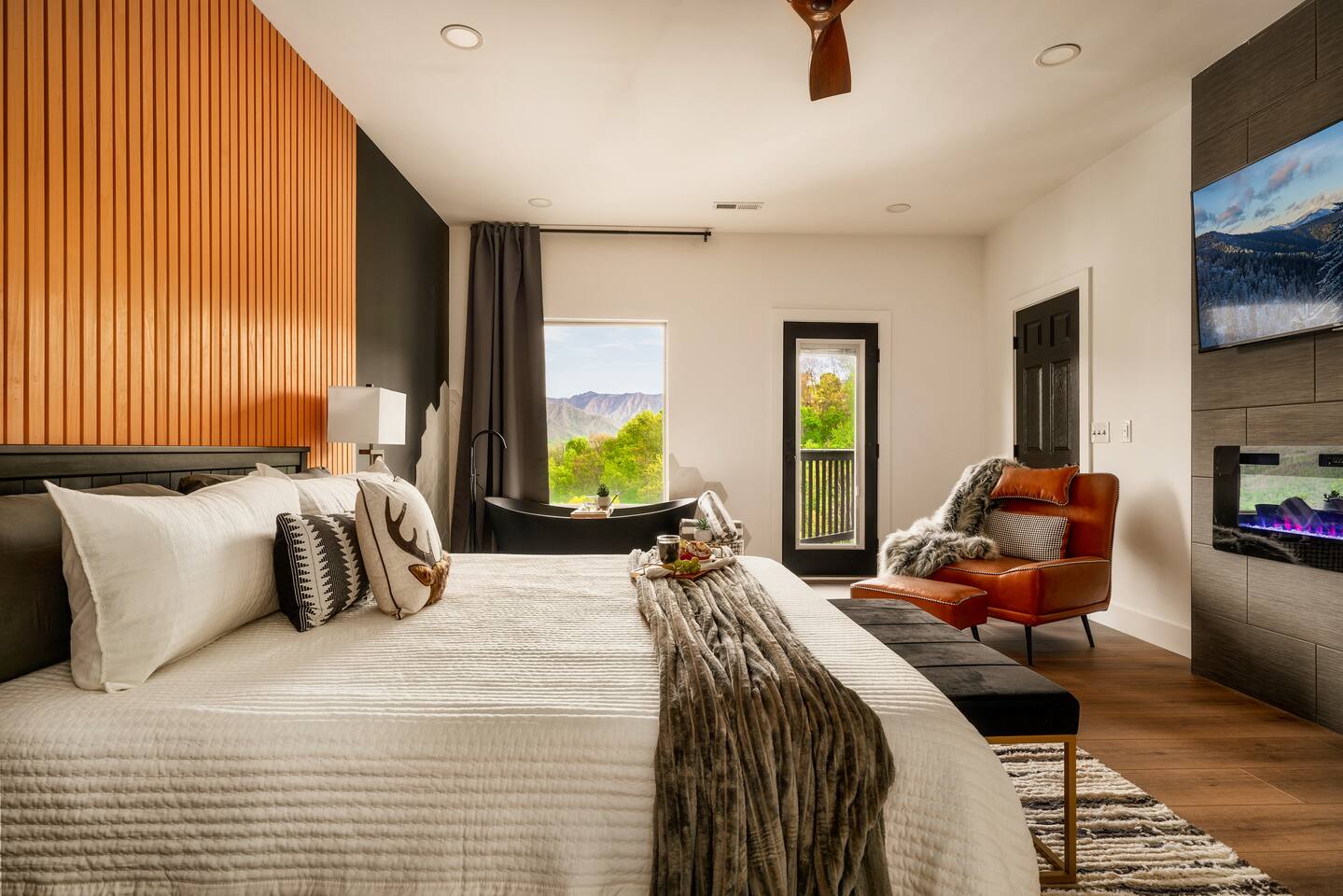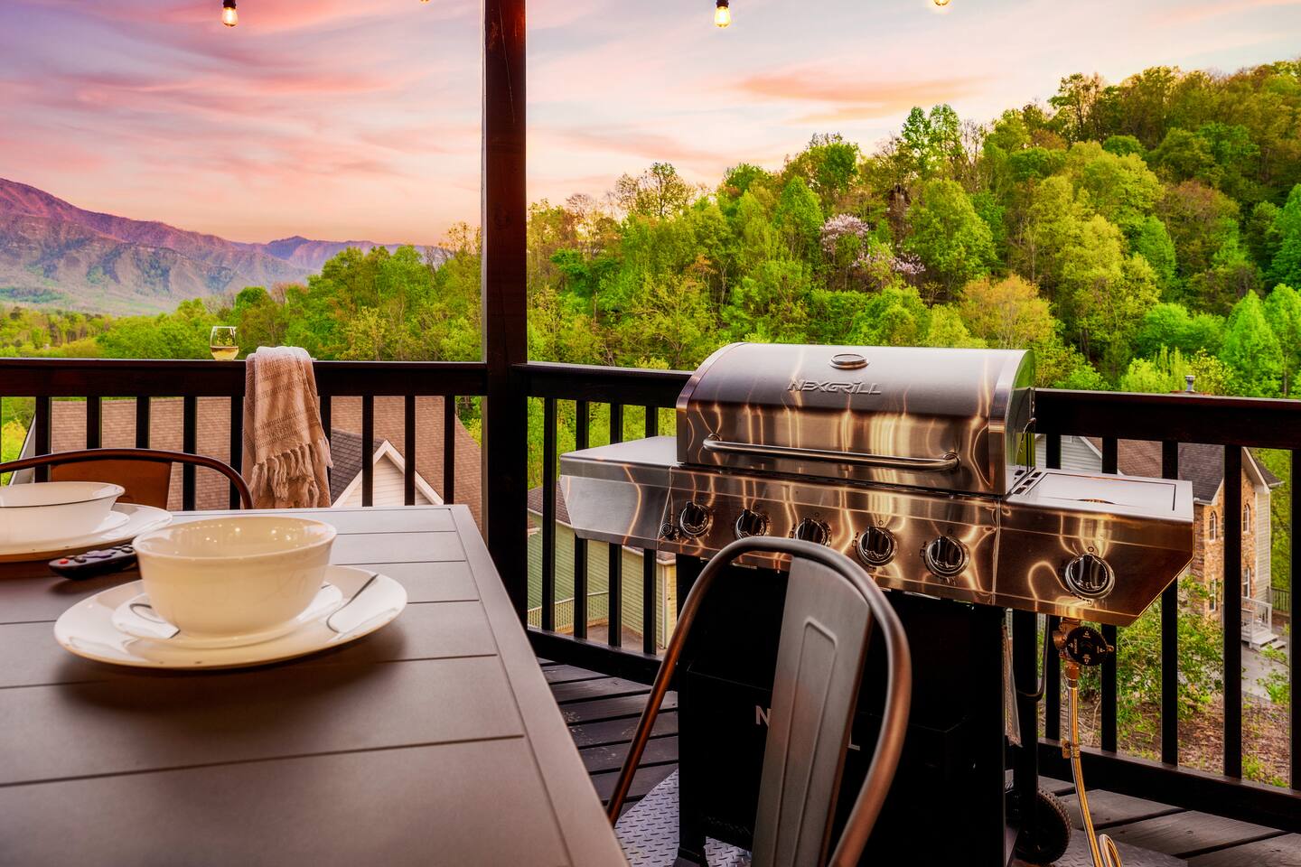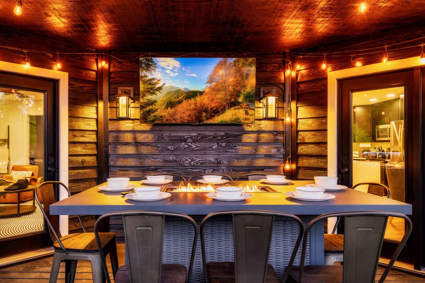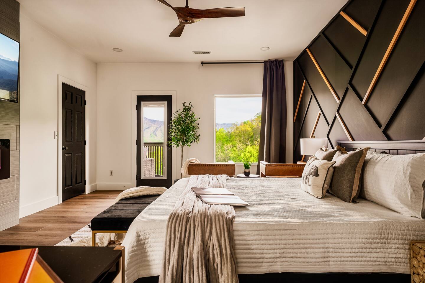 ✹ Unbeatable Breathtaking Views: Three private decks offer stunning mountain vistas, ideal for morning coffee, sunset cocktails, or stargazing by the firepit. ✹ Elegant Living Spaces: The open-concept living area features a striking 3-sided electric fireplace and a 65” smart TV, giving you a cozy, stylish place to unwind. ✹ Culinary Haven: A gourmet kitchen awaits with top-of-the-line appliances, an espresso machine, and a K-brew coffee maker. Enjoy your meals around a spacious dining table for 8, or dine al fresco with the mountains as your backdrop. ✹ Luxurious Bedroom Retreats: Three private bedroom sanctuaries, including a master suite with a king bed, freestanding tub, and private deck access, promise ultimate relaxation. ✹ Perfect Work-Life Balance: The second bedroom includes a work-ready desk, perfect for remote work without sacrificing comfort. ✹ Entertainment Galore: Challenge friends and family in the expansive game room with a pool table, multicade, and Golden Tee golf – plus a fun rock climbing wall for the kids. ✹ Hot Tub Bliss: Soak in a premium hot tub while gazing at the mountains. It’s the ultimate way to unwind after a day of exploring. ✹ Firepit Gatherings: Cozy up around the firepit on a cool mountain night, sharing stories under the stars. Welcome to your luxury mountain retreat in the heart of the Smokies, where modern comfort meets breathtaking natural beauty. As you step into the open-concept living area, you'll be captivated by the stunning 3-sided electric fireplace that serves as the room's centerpiece. Sink into premium leather couches or designer accent chairs while enjoying your favorite entertainment on the impressive 65" smart TV. Just beyond, the main level deck offers your first glimpse of the magnificent mountain panoramas that surround the property. Your culinary adventures begin in our fully equipped kitchen, where sleek stainless steel appliances await your creativity. Start your mornings with the perfect brew from our espresso machine or K-brew coffee maker, then gather with loved ones around the elegant 8-person dining table. For an unforgettable dining experience, step onto the deck where al fresco meals come with a side of stunning mountain views. Each of our three thoughtfully designed bedrooms offers its own private sanctuary. The upper-level primary suite boasts a sumptuous king bed and a luxury ensuite bathroom featuring a free-standing tub, anti-fog mirrors, and private deck access. The second bedroom provides another king bed and a modern workspace perfect for remote work, complete with its own ensuite bathroom. On the lower level, families or groups will appreciate the queen-over-queen bunk bed with a private bath, ensuring comfort and privacy for all guests. Entertainment abounds in our expansive game room, a space designed for creating lasting memories. Challenge your companions to a game of pool, explore over 3,000 classic games on the multicade machine, or perfect your swing with Golden Tee golf. For our younger guests, an exciting rock climbing wall in the bunk room provides additional adventure under adult supervision. The outdoor living spaces truly set our chalet apart, with three private decks showcasing the majesty of the Smokies. Soak in the premium hot tub while drinking in mountain vistas, gather around the outdoor firepit dining table for memorable meals under the stars, or simply unwind in the cozy conversation area by the firepit. We've thought of everything to make your family comfortable, from a Pack 'n Play and highchair to children's dinnerware and essential toiletries. For eco-conscious guests, we're pleased to offer a Level 2 electric vehicle charging station, allowing you to power up your electric vehicle during your stay. With free parking for three vehicles and a perfect location near downtown Gatlinburg, you'll have easy access to local attractions, restaurants, shopping, and mountain activities. Your stay includes complimentary access to resort-style amenities, including three community clubhouses (available from Memorial Day to Labor Day) with amenities including outdoor pools, pickle ball court, tennis court, and a fitness center. Experience the perfect blend of luxury and mountain charm in our welcoming chalet. Whether you're seeking adventure or relaxation, this exceptional retreat provides an unforgettable backdrop for your Gatlinburg getaway. Book now to create lasting memories in the heart of the Smokies!