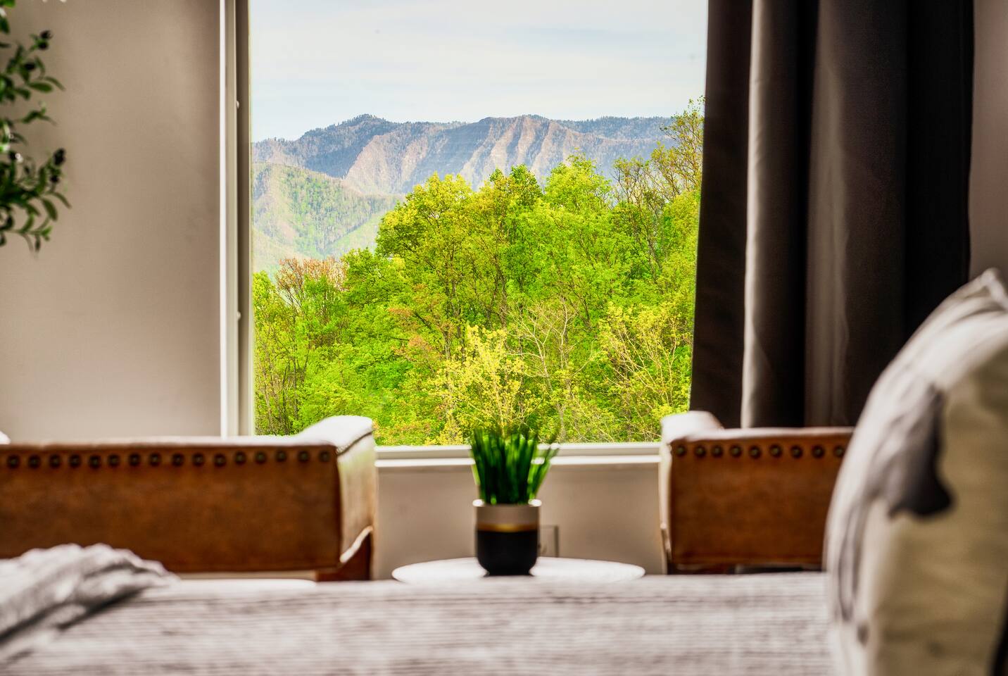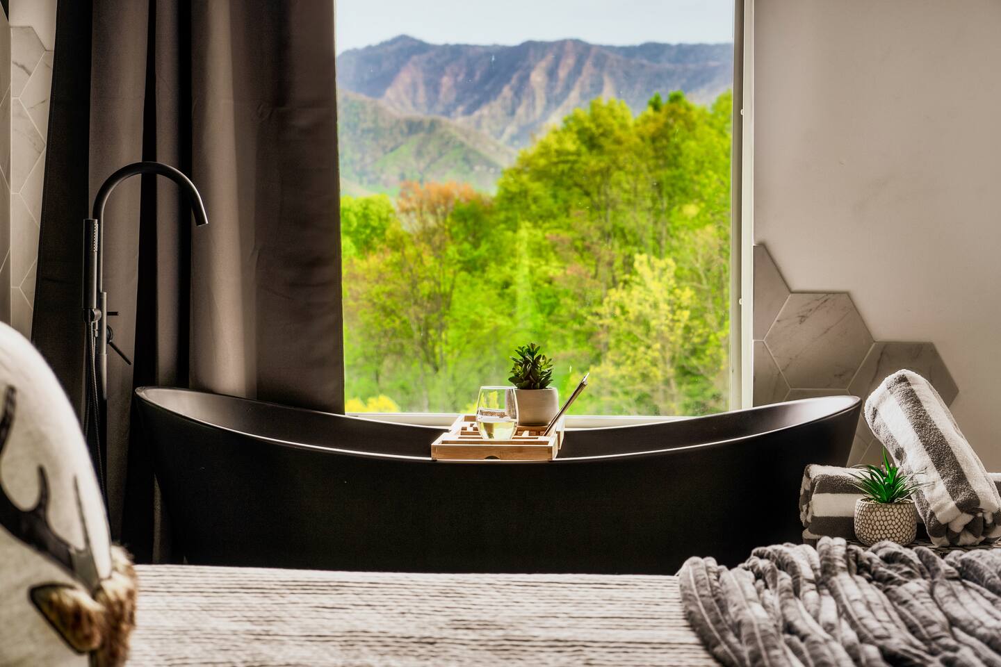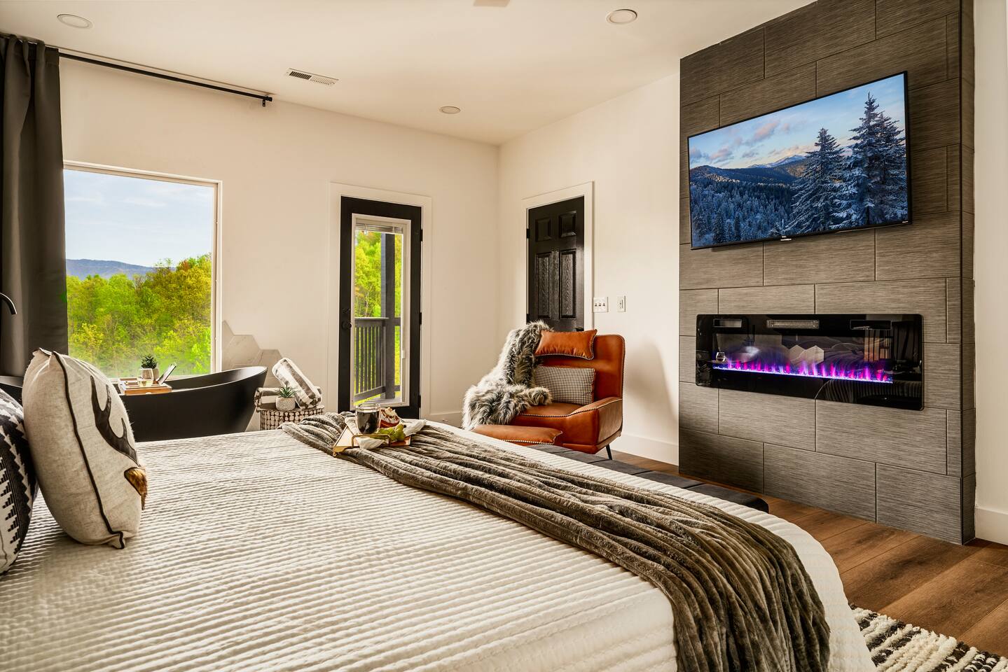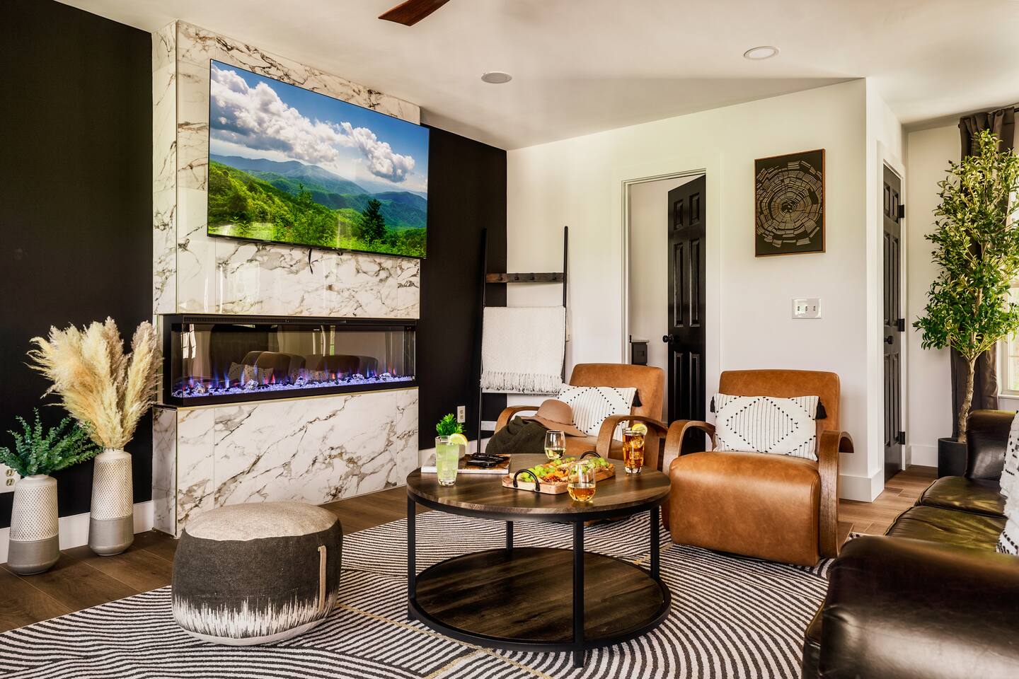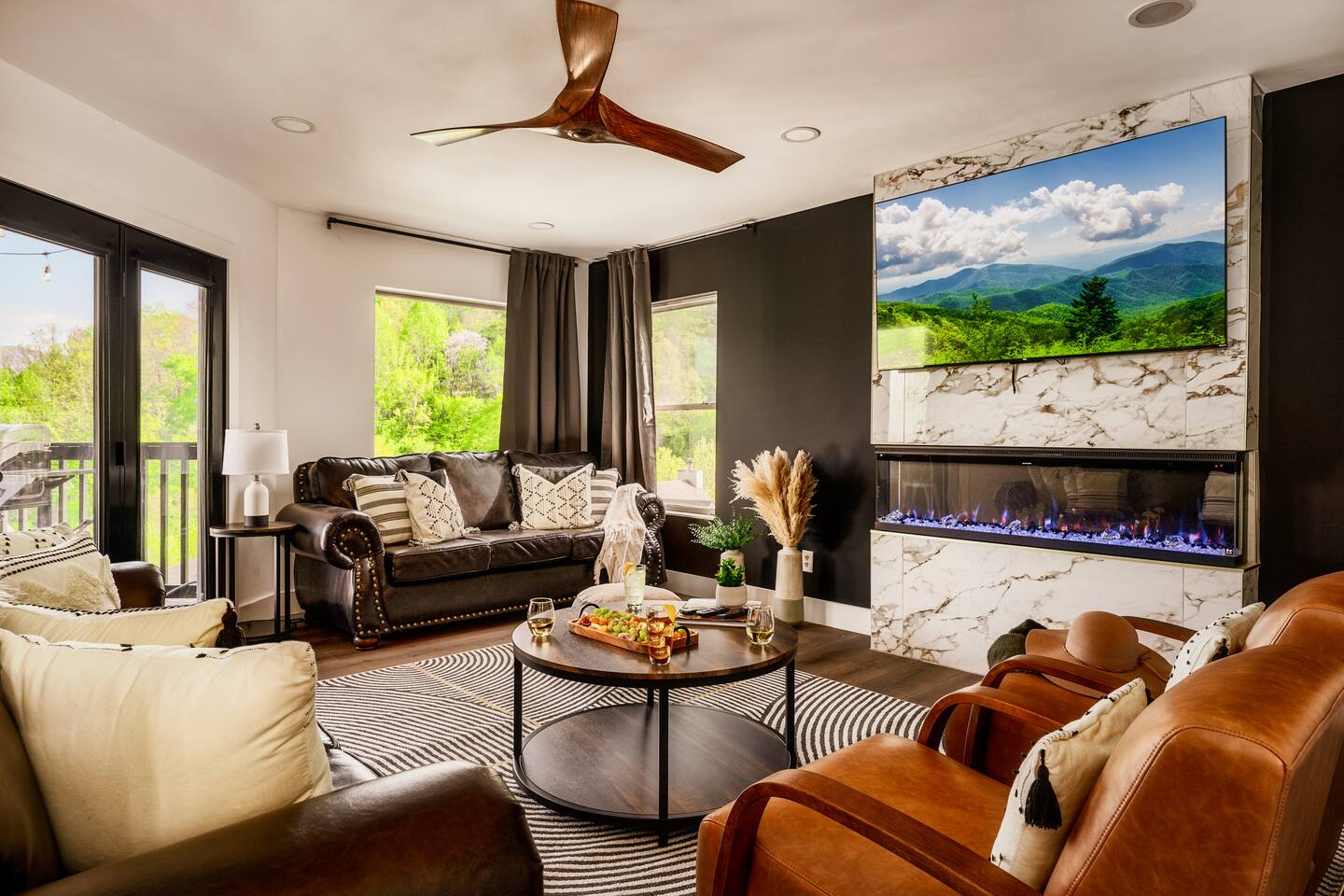 Escape to our luxury mountain chalet, where Smoky Mountain views and modern comfort await! Relax by the unique 3-sided fireplace, unwind in the living area with a 65” smart TV, or soak in the hot tub with panoramic mountain views. The gourmet kitchen with stainless appliances, espresso machine, and dining for 8 makes every meal memorable. Enjoy a game room with pool, multicades and even a rock climbing wall. The master bedroom features a tub by the window, offering breathtaking mountain views.
