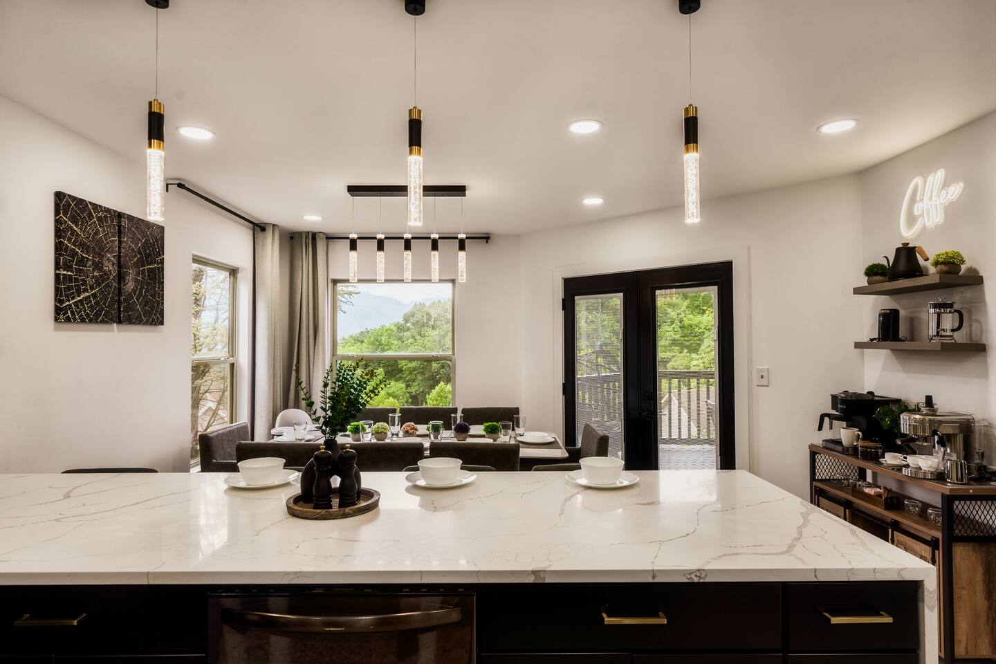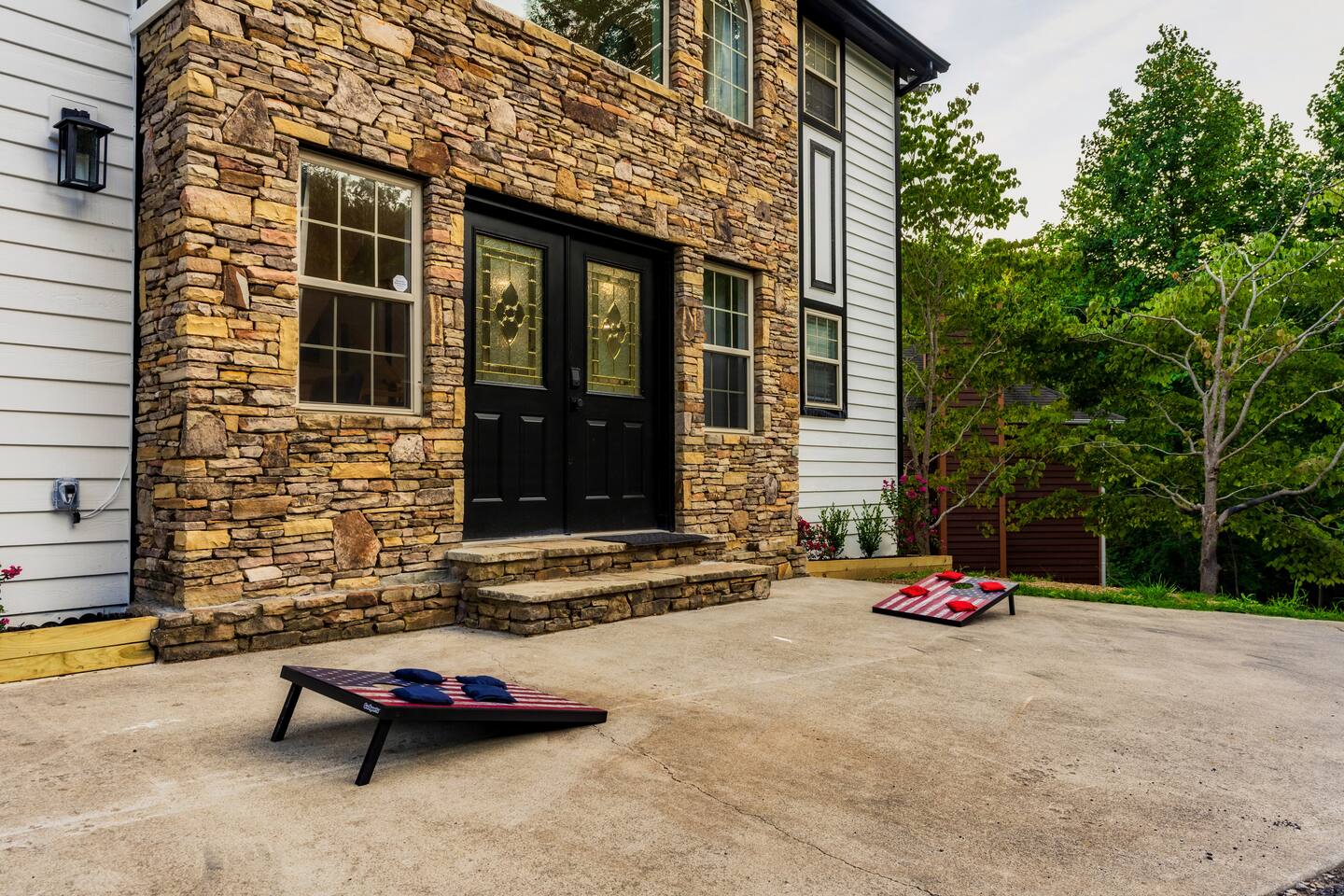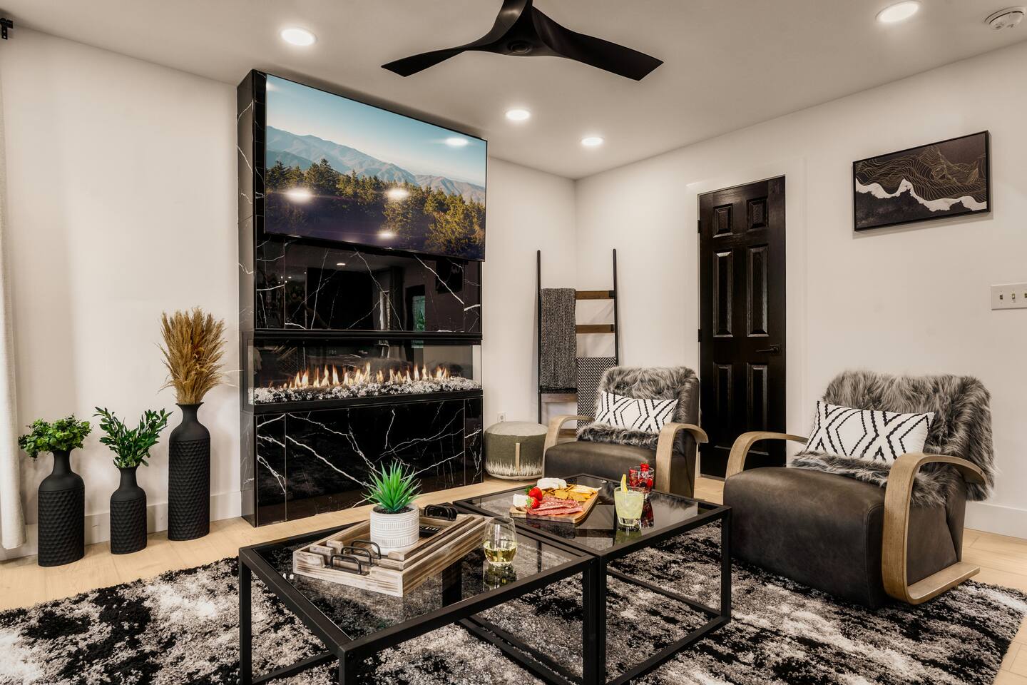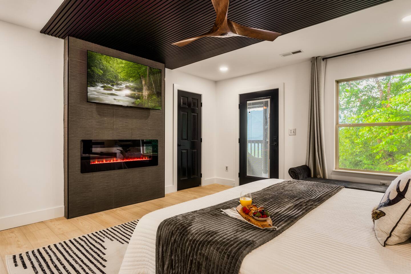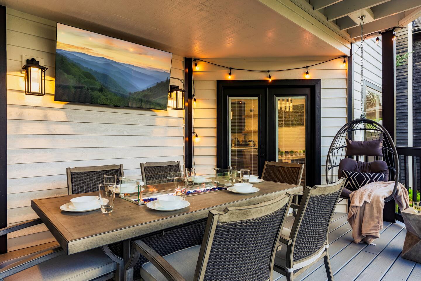 ✹ Stunning Open-Concept Living Area: Features a unique 3-sided electric fireplace, plush leather sofas, and a 65” Smart TV for cozy movie nights. ✹ Gourmet Kitchen & Coffee Station: Fully equipped with stainless steel appliances, stylish pendant lighting, and an espresso machine, K-brew maker, and French press. ✹ Elegant Indoor & Outdoor Dining: Dining table for 8 and a main deck firepit dining table with a Smart TV for dining under the stars. ✹ Luxurious Primary Suite: King bed, custom lighting, electric fireplace, 55” Smart TV, and spa-like ensuite with oversized walk-in shower. ✹ Second Master Suite: King bed, electric fireplace, 55” Smart TV, and ensuite bathroom with a soaking tub for relaxation. ✹ Family-Friendly Bunk Room: Queen-over-queen bunk bed, private bathroom, and fun rock climbing wall for kids under supervision. ✹ Game Room Fun: Pool table, multicade machine, Golden Tee arcade, board games, and 65” Smart TV for endless entertainment. ✹ Three-Level Deck Experience: Lower deck swim spa, main deck firepit dining & egg chair swing, and upper deck with cozy firepit seating. ✹ Private Swim Spa: Exclusive outdoor swim spa on the lower deck, perfect for relaxation while enjoying mountain views. ✹ Prime Location: Just 2 miles from Ober Gatlinburg, perfect for winter sports. Step into the main level, where an impressive open-concept living space welcomes you with its modern three-sided electric fireplace, leather sofas, and designer accent chairs. The 65" Smart TV and designer accent chairs create the perfect setting for cozy movie nights. The gourmet kitchen shines with stainless steel appliances and a contemporary peninsular seating area adorned with stylish pendant lighting. Coffee enthusiasts will appreciate our complete station featuring an espresso machine, K-brew maker, and French press. The elegant dining table seats 8, while the main deck offers an exceptional outdoor dining experience with its firepit table and Smart TV – imagine watching your favorite sports match or show while dining under the mountain sky! The sleeping arrangements are thoughtfully designed across three luxurious bedrooms. The upper-level primary suite features a sumptuous king bed with custom lighting and thoughtfully placed outlets, an electric fireplace for ambiance, a 55" Smart TV, and a spa-like ensuite bathroom with an oversized walk-in shower. The second master suite mirrors this luxury with its own king bed, electric fireplace, 55" Smart TV, and an ensuite featuring a relaxing soaking tub. On the lower level, families will love the third bedroom with its queen-over-queen bunk bed, private bathroom, and a fun rock climbing wall for the kids (under adult supervision, of course). All bathrooms boast modern floating vanities, anti-fog mirrors, and premium toiletries. Entertainment abounds in our professionally equipped game room, featuring a pool table, multicade machine with over 60 classic games, and Golden Tee arcade. A comfortable leather sofa and bar-style seating area create the perfect spot for spectators or game nights, complete with board games and a 65" Smart TV. For outdoor entertainment, enjoy cornhole in the driveway or relax in our three-level deck system. Each deck offers a unique experience: unwind in the private swim spa on the lower deck, enjoy meals at the firepit dining table on the main deck, or gather around the cozy fire pit seating on the upper deck. The egg chair swing provides the perfect perch for taking in the magnificent mountain views, whether you're savoring your morning coffee at sunrise or stargazing in the evening. Families will find everything they need for a comfortable stay, including a pack 'n play, highchair, baby bathtub, and kid-friendly dinnerware. Unwind with exclusive access to three distinct clubhouses, each with its own inviting pool for you to enjoy from Memorial Day through Labor Day. Stay active with a fitness center, challenge yourself on the tennis court, or have fun on two pickleball courts—all designed to make your stay as relaxing or invigorating as you like. The chalet's prime location on Ski Mountain, just 2 miles from Ober Gatlinburg, makes it the perfect winter sports base camp. From mid-November to mid-January, the chalet transforms into a magical holiday retreat with festive decorations throughout. Modern conveniences include free parking for three vehicles and an exclusive EV charging station for our guests. Your perfect mountain getaway awaits with all the essentials provided – just bring your groceries and your sense of adventure! Whether you're seeking a romantic retreat, family vacation, or group gathering, our chalet offers the ideal setting for creating lasting memories in the heart of the Smoky Mountains. *Experience the height of mountain luxury – book your stay today!*