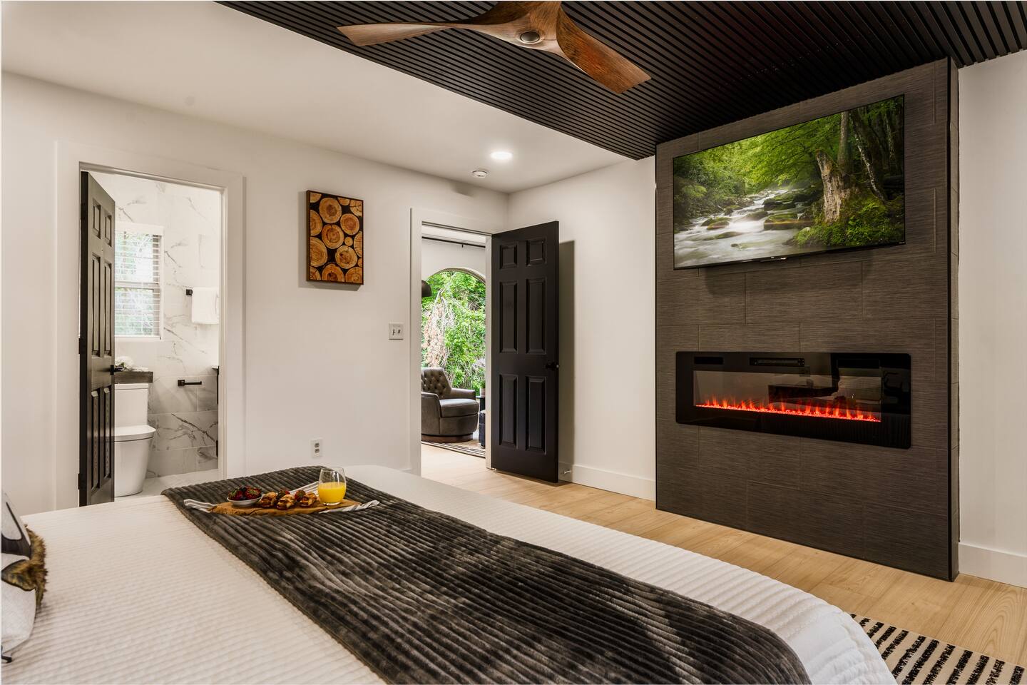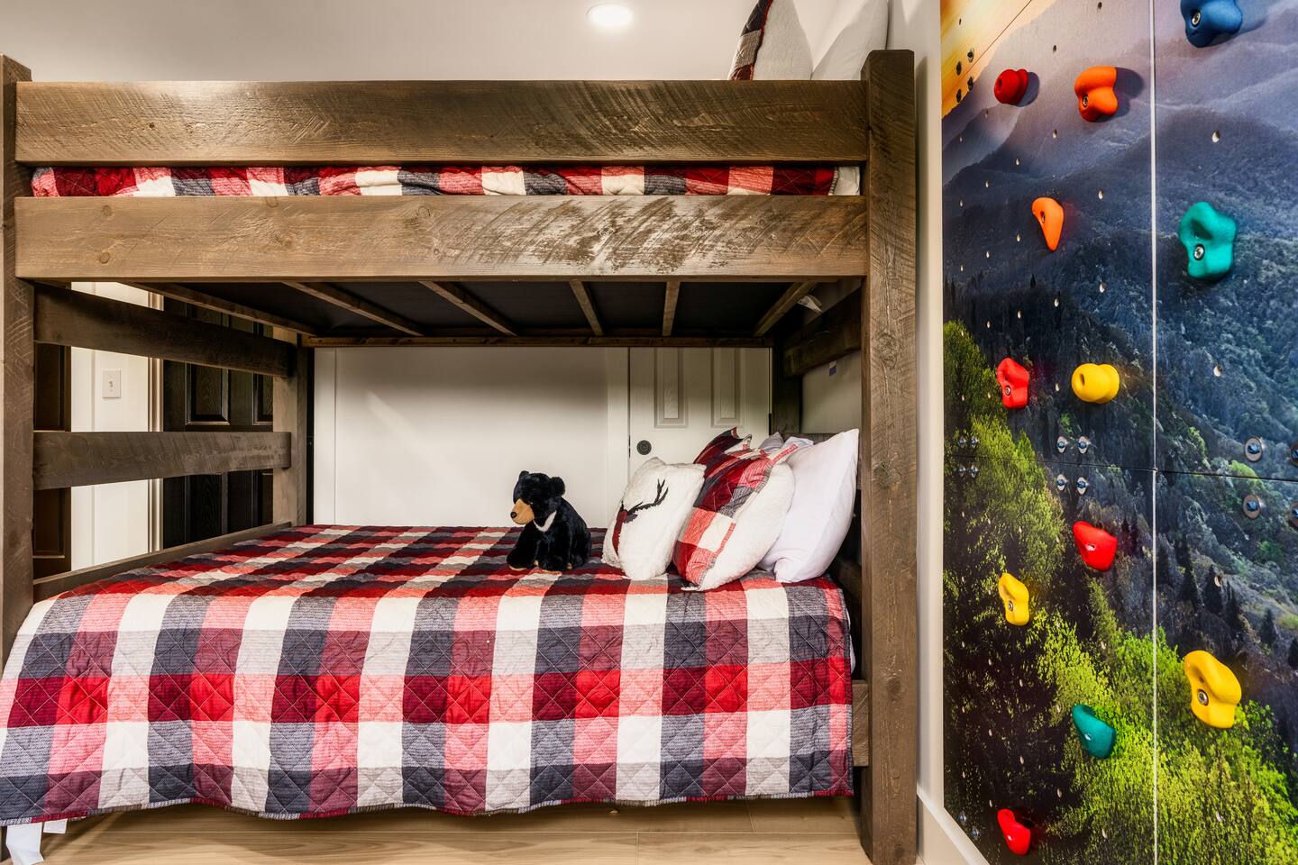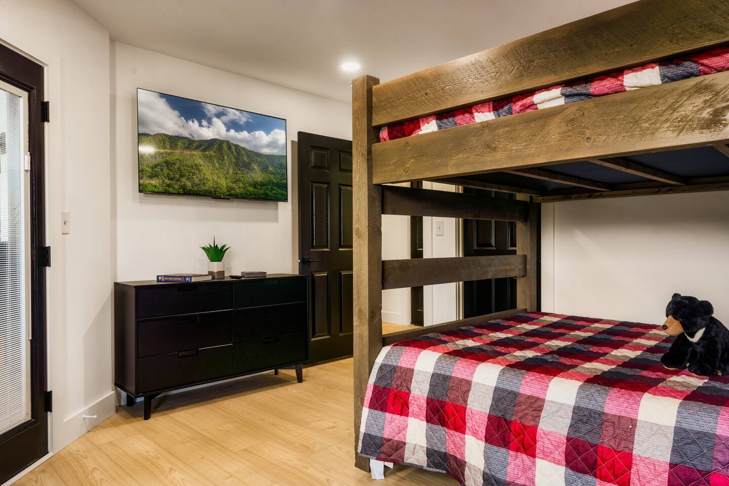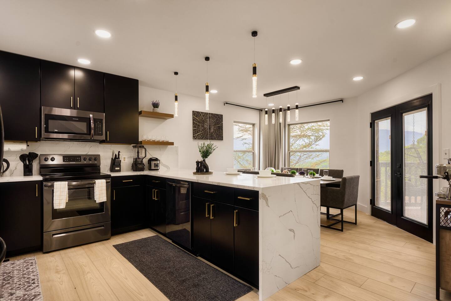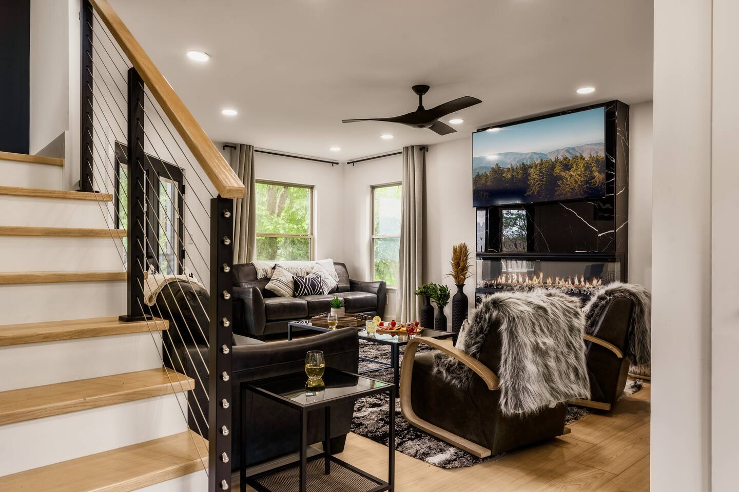 ✹ Stunning Open-Concept Living Area: Features a unique 3-sided electric fireplace, plush leather sofas, and a 65” Smart TV for cozy movie nights. ✹ Gourmet Kitchen & Coffee Station: Fully equipped with stainless steel appliances, stylish pendant lighting, and an espresso machine, K-brew maker, and French press. ✹ Elegant Indoor & Outdoor Dining: Dining table for 8 and a main deck firepit dining table with a Smart TV for dining under the stars. ✹ Luxurious Primary Suite: King bed, custom lighting, electric fireplace, 55” Smart TV, and spa-like ensuite with oversized walk-in shower. ✹ Second Master Suite: King bed, electric fireplace, 55” Smart TV, and ensuite bathroom with a soaking tub for relaxation. ✹ Family-Friendly Bunk Room: Queen-over-queen bunk bed, private bathroom, and fun rock climbing wall for kids under supervision. ✹ Game Room Fun: Pool table, multicade machine, Golden Tee arcade, board games, and 65” Smart TV for endless entertainment. ✹ Three-Level Deck Experience: Lower deck swim spa, main deck firepit dining & egg chair swing, and upper deck with cozy firepit seating. ✹ Private Swim Spa: Exclusive outdoor swim spa on the lower deck, perfect for relaxation while enjoying mountain views. ✹ Prime Location: Just 2 miles from Ober Gatlinburg, perfect for winter sports. Step into the main level, where an impressive open-concept living space welcomes you with its modern three-sided electric fireplace, leather sofas, and designer accent chairs. The 65" Smart TV and designer accent chairs create the perfect setting for cozy movie nights. The gourmet kitchen shines with stainless steel appliances and a contemporary peninsular seating area adorned with stylish pendant lighting. Coffee enthusiasts will appreciate our complete station featuring an espresso machine, K-brew maker, and French press. The elegant dining table seats 8, while the main deck offers an exceptional outdoor dining experience with its firepit table and Smart TV – imagine watching your favorite sports match or show while dining under the mountain sky! The sleeping arrangements are thoughtfully designed across three luxurious bedrooms. The upper-level primary suite features a sumptuous king bed with custom lighting and thoughtfully placed outlets, an electric fireplace for ambiance, a 55" Smart TV, and a spa-like ensuite bathroom with an oversized walk-in shower. The second master suite mirrors this luxury with its own king bed, electric fireplace, 55" Smart TV, and an ensuite featuring a relaxing soaking tub. On the lower level, families will love the third bedroom with its queen-over-queen bunk bed, private bathroom, and a fun rock climbing wall for the kids (under adult supervision, of course). All bathrooms boast modern floating vanities, anti-fog mirrors, and premium toiletries. Entertainment abounds in our professionally equipped game room, featuring a pool table, multicade machine with over 60 classic games, and Golden Tee arcade. A comfortable leather sofa and bar-style seating area create the perfect spot for spectators or game nights, complete with board games and a 65" Smart TV. For outdoor entertainment, enjoy cornhole in the driveway or relax in our three-level deck system. Each deck offers a unique experience: unwind in the private swim spa on the lower deck, enjoy meals at the firepit dining table on the main deck, or gather around the cozy fire pit seating on the upper deck. The egg chair swing provides the perfect perch for taking in the magnificent mountain views, whether you're savoring your morning coffee at sunrise or stargazing in the evening. Families will find everything they need for a comfortable stay, including a pack 'n play, highchair, baby bathtub, and kid-friendly dinnerware. Unwind with exclusive access to three distinct clubhouses, each with its own inviting pool for you to enjoy from Memorial Day through Labor Day. Stay active with a fitness center, challenge yourself on the tennis court, or have fun on two pickleball courts—all designed to make your stay as relaxing or invigorating as you like. The chalet's prime location on Ski Mountain, just 2 miles from Ober Gatlinburg, makes it the perfect winter sports base camp. From mid-November to mid-January, the chalet transforms into a magical holiday retreat with festive decorations throughout. Modern conveniences include free parking for three vehicles and an exclusive EV charging station for our guests. Your perfect mountain getaway awaits with all the essentials provided – just bring your groceries and your sense of adventure! Whether you're seeking a romantic retreat, family vacation, or group gathering, our chalet offers the ideal setting for creating lasting memories in the heart of the Smoky Mountains. *Experience the height of mountain luxury – book your stay today!*