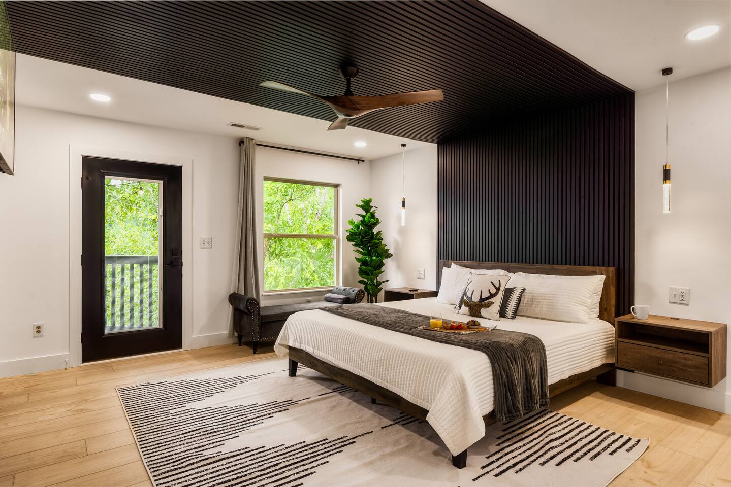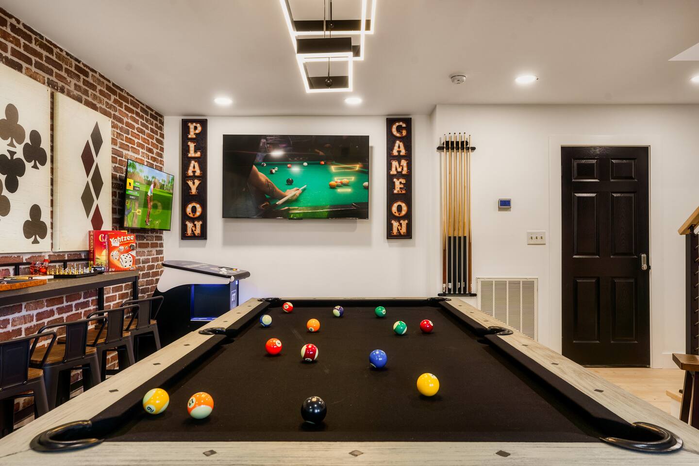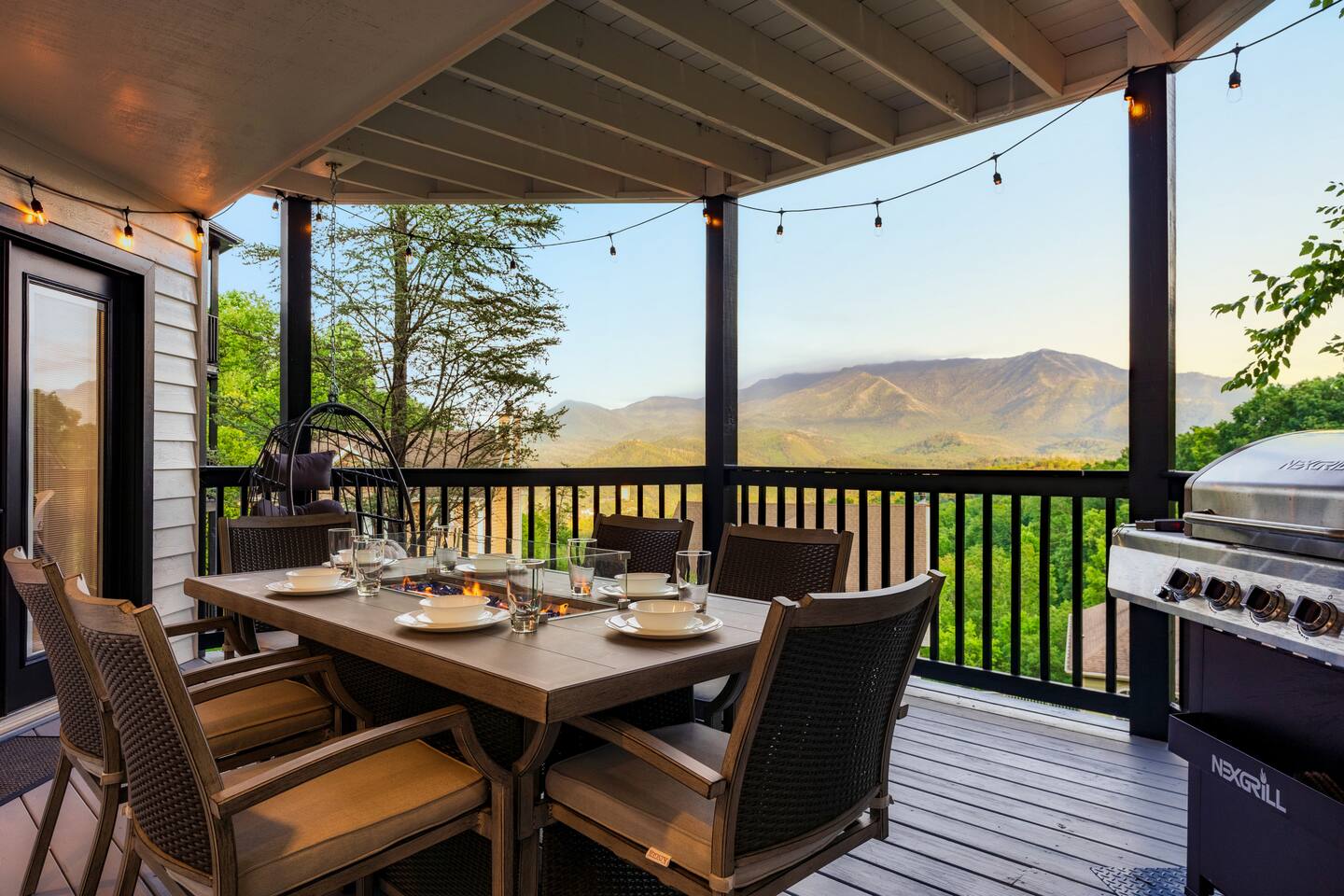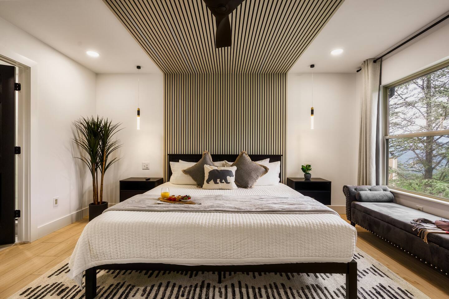 ✹ Stunning Open-Concept Living Area: Features a unique 3-sided electric fireplace, plush leather sofas, and a 65” Smart TV for cozy movie nights. ✹ Gourmet Kitchen & Coffee Station: Fully equipped with stainless steel appliances, stylish pendant lighting, and an espresso machine, K-brew maker, and French press. ✹ Elegant Indoor & Outdoor Dining: Dining table for 8 and a main deck firepit dining table with a Smart TV for dining under the stars. ✹ Luxurious Primary Suite: King bed, custom lighting, electric fireplace, 55” Smart TV, and spa-like ensuite with oversized walk-in shower. ✹ Second Master Suite: King bed, electric fireplace, 55” Smart TV, and ensuite bathroom with a soaking tub for relaxation. ✹ Family-Friendly Bunk Room: Queen-over-queen bunk bed, private bathroom, and fun rock climbing wall for kids under supervision. ✹ Game Room Fun: Pool table, multicade machine, Golden Tee arcade, board games, and 65” Smart TV for endless entertainment. ✹ Three-Level Deck Experience: Lower deck swim spa, main deck firepit dining & egg chair swing, and upper deck with cozy firepit seating. ✹ Private Swim Spa: Exclusive outdoor swim spa on the lower deck, perfect for relaxation while enjoying mountain views. ✹ Prime Location: Just 2 miles from Ober Gatlinburg, perfect for winter sports. Step into the main level, where an impressive open-concept living space welcomes you with its modern three-sided electric fireplace, leather sofas, and designer accent chairs. The 65" Smart TV and designer accent chairs create the perfect setting for cozy movie nights. The gourmet kitchen shines with stainless steel appliances and a contemporary peninsular seating area adorned with stylish pendant lighting. Coffee enthusiasts will appreciate our complete station featuring an espresso machine, K-brew maker, and French press. The elegant dining table seats 8, while the main deck offers an exceptional outdoor dining experience with its firepit table and Smart TV – imagine watching your favorite sports match or show while dining under the mountain sky! The sleeping arrangements are thoughtfully designed across three luxurious bedrooms. The upper-level primary suite features a sumptuous king bed with custom lighting and thoughtfully placed outlets, an electric fireplace for ambiance, a 55" Smart TV, and a spa-like ensuite bathroom with an oversized walk-in shower. The second master suite mirrors this luxury with its own king bed, electric fireplace, 55" Smart TV, and an ensuite featuring a relaxing soaking tub. On the lower level, families will love the third bedroom with its queen-over-queen bunk bed, private bathroom, and a fun rock climbing wall for the kids (under adult supervision, of course). All bathrooms boast modern floating vanities, anti-fog mirrors, and premium toiletries. Entertainment abounds in our professionally equipped game room, featuring a pool table, multicade machine with over 60 classic games, and Golden Tee arcade. A comfortable leather sofa and bar-style seating area create the perfect spot for spectators or game nights, complete with board games and a 65" Smart TV. For outdoor entertainment, enjoy cornhole in the driveway or relax in our three-level deck system. Each deck offers a unique experience: unwind in the private swim spa on the lower deck, enjoy meals at the firepit dining table on the main deck, or gather around the cozy fire pit seating on the upper deck. The egg chair swing provides the perfect perch for taking in the magnificent mountain views, whether you're savoring your morning coffee at sunrise or stargazing in the evening. Families will find everything they need for a comfortable stay, including a pack 'n play, highchair, baby bathtub, and kid-friendly dinnerware. Unwind with exclusive access to three distinct clubhouses, each with its own inviting pool for you to enjoy from Memorial Day through Labor Day. Stay active with a fitness center, challenge yourself on the tennis court, or have fun on two pickleball courts—all designed to make your stay as relaxing or invigorating as you like. The chalet's prime location on Ski Mountain, just 2 miles from Ober Gatlinburg, makes it the perfect winter sports base camp. From mid-November to mid-January, the chalet transforms into a magical holiday retreat with festive decorations throughout. Modern conveniences include free parking for three vehicles and an exclusive EV charging station for our guests. Your perfect mountain getaway awaits with all the essentials provided – just bring your groceries and your sense of adventure! Whether you're seeking a romantic retreat, family vacation, or group gathering, our chalet offers the ideal setting for creating lasting memories in the heart of the Smoky Mountains. *Experience the height of mountain luxury – book your stay today!*